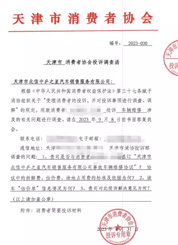 天津市消协向“北信中乒奔驰4S店”电话联系沟通情况并确认收件信息后,今年6月,调查了解拆解费、 ×